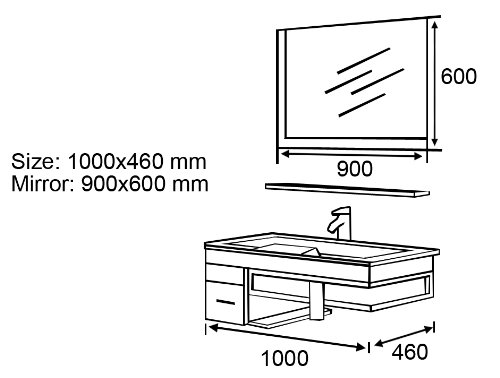 Specchio, piccolo ripiano in vetro, lavandino, armadietto