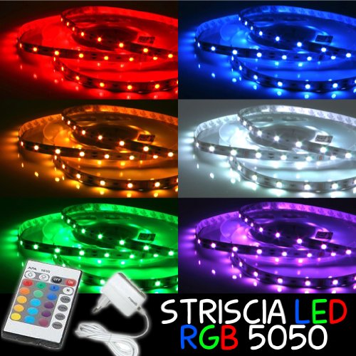 La strip led misura 5Mt, è composta da luminosissimi LED SMD,è possibile tagliarla ogni tre LED per ridurne all'occorrenza la misura o aumentarne la stessa semplicemente collegandone un'altra o quante ne preferite all'attacco utilizzando sempre un unico telecomando e un'unica centralina!